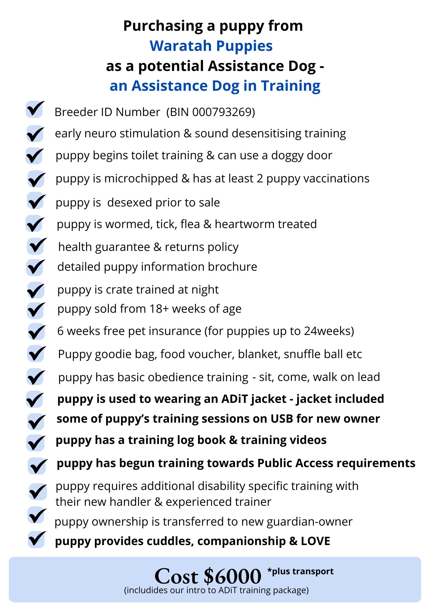 - tax invoice (if you are using NDIS funding to purchase your puppy, please let us know so we can provide relevant information on your Invoice)